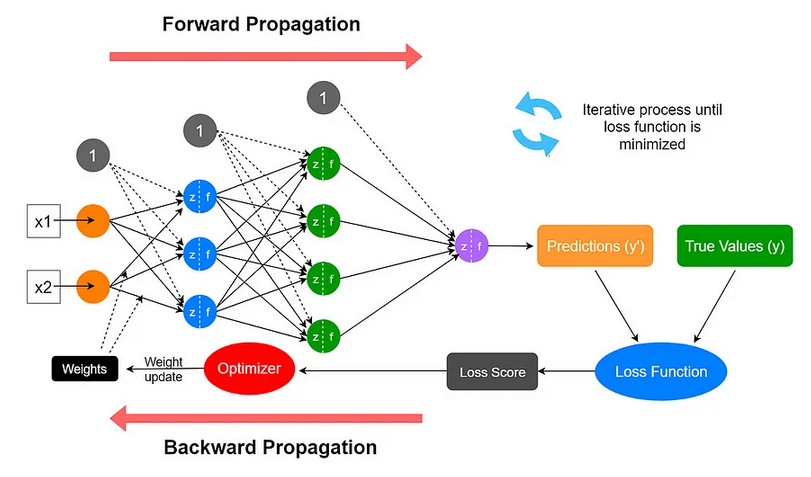Backward propagation, or backpropagation, is the process of adjusting the weights and biases in the network based on the calculated loss. This step involves propagating the error backwards through the network, allowing the model to learn from its mistakes and improve its performance in future predictions. This iterative process continues until the loss is minimized, and the network achieves satisfactory accuracy[11][14].