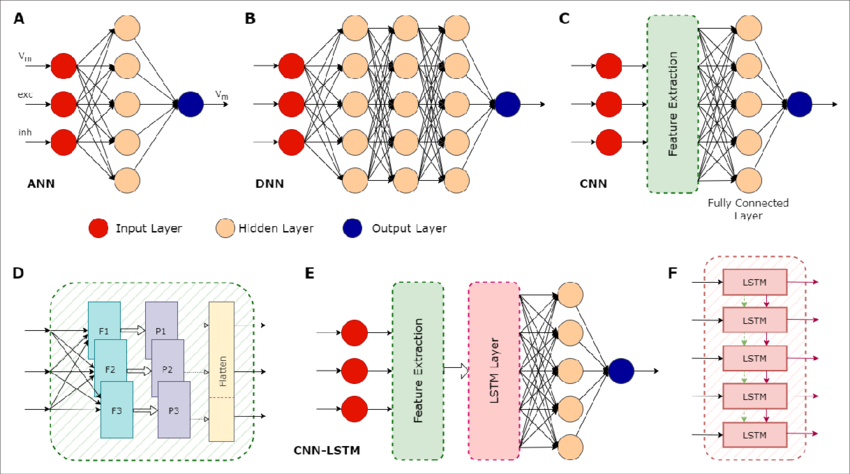 (A) A basic ANN consists of an input layer (red circles), one or more hidden layers (peach circles), and an output layer (blue circle). In the case of neuronal modelling, the input could be features such as the membrane potential (V m ), and the excitatory (exc) and inhibitory (inh) synaptic inputs. The hidden layers perform computations on the inputs, with the actual operations depending on the type of ANN. Their objective is to identify features in the inputs and use these to correlate a given input and the correct output. An ANN can have multiple outputs: in this example, the output is a prediction of the membrane potential. (B) A deep neural network (DNN) is an ANN with multiple hidden layers. (C) A convolutional neural network (CNN) is a type of DNN that can be trained to extract important features contained in the input data, which can then be used as inputs to the other hidden layers, significantly improving the performance of the overall network. (D) Some details of the feature extraction process of a CNN, which consists of several hidden layers. First, it has multiple filters (F1, F2, F3), each configured to capture specific features. This process can greatly increase the size of the data, so a pooling layer (P1, P2, P3) is then used to reduce this size. The pooling process does not lead to the loss of valuable data; instead, it helps remove noise and consolidate meaningful data. The flattening layer converts the pooled data into a 1-dimensional stream. This serves as an input for the subsequent fully connected layer, which does the final evaluation to produce the output based on the features extracted by the convolution layers. (E) A CNN with a long short-term memory (LSTM) layer. The additional LSTM layer enables the network to benefit from long-term memory, in addition to the existent short-term working memory. (F) The LSTM layer achieves this long-term memory through its ability to relay both the cell state (dashed green arrows) and the output generated by each module (solid maroon arrows) across its several modules, allowing the flow of useful information. This enables the network to better identify context in the input data over longer time periods. CNN-LSTMs have been found useful for predicting time series data.Feedforward Neural Networks (FNNs)